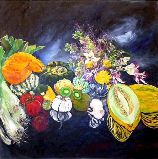 Casaba Melon with flowers, Oil On Cavas, 48"x48"